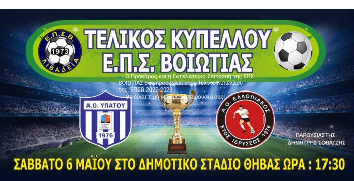 Το Σάββατο 6 Μαΐου 2023 και ώρα 17.30, το Δημοτικό Στάδιο Θήβας θα φιλοξενήσει τον Αγώνα για τον Τελικό Κυπέλλου ανάμεσα στις ομάδες Α.Ο. ΥΠΑΤΟΥ και Α.Ο. ΕΛΛΟΠΙΑΚΟΥ. Ο Δήμος Θηβαίων και ο Δημοτικός Οργανισμός Θήβας διοργανώνουν για πρώτη φορά σε συνεργασία με τον Πρόεδρο Εκτελεστικής Επιτροπής της Ε.Π.Σ Βοιωτίας, μια μεγάλη γιορτή στο πλαίσιο της οποίας αναμένουμε την διεκδίκηση του τρόπαιου του Κυπέλλου της Βοιωτίας.