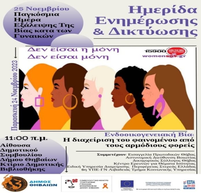 Ημερίδα ενημέρωσης και δικτύωσης με θέμα «Ενδοοικογενειακή Βία: Η Διαχείριση του φαινομένου από τους αρμόδιους φορείς», διοργανώνουν ο Δήμος Θηβαίων και το Συμβουλευτικό Κέντρο Υποστήριξης Γυναικών Θυμάτων Βίας, με αφορμή την Παγκόσμια Ημέρα Εξάλειψης της Βίας Κατά των Γυναικών(25/11).