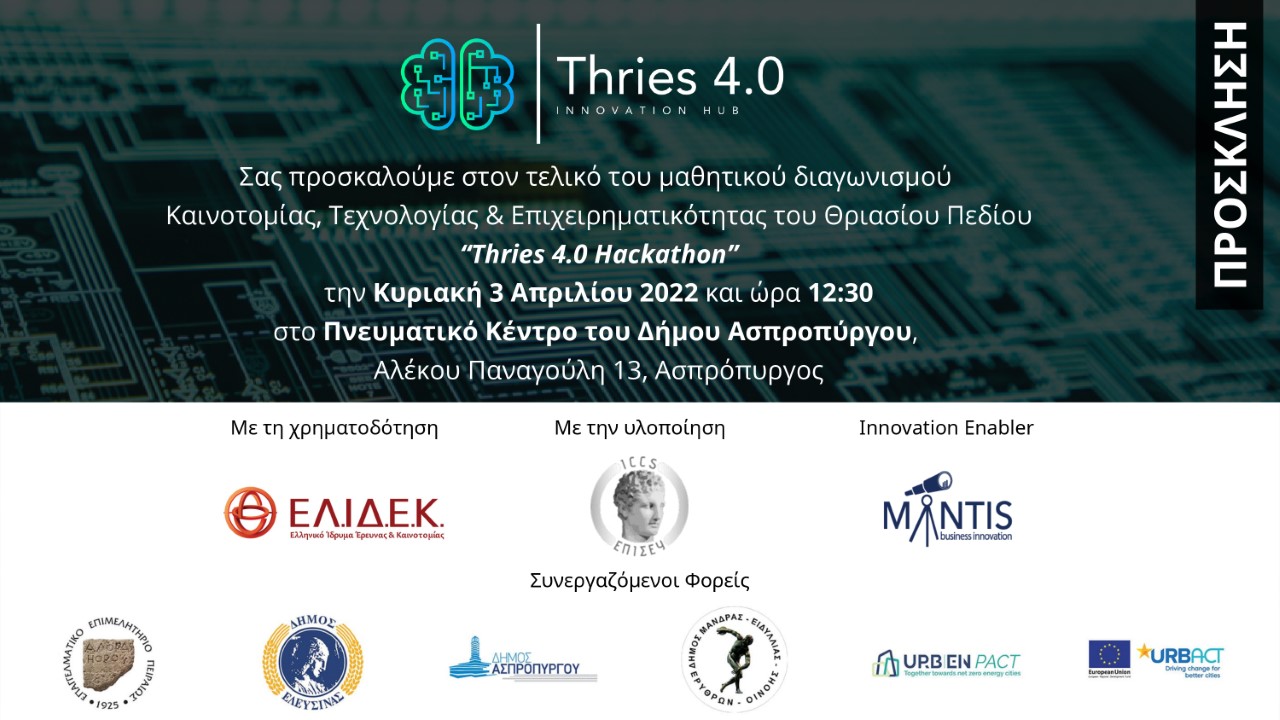 Στο πλαίσιο αυτό και με στόχο την εκπαίδευση των νέων δημιουργήθηκε το “Thries 4.0 Hackathon”, ένας μαθητικός διαγωνισμός καινοτομίας και επιχειρηματικότητας που απευθύνεται σε μαθητές που φοιτούν στις τάξεις Γ’ Γυμνασίου και Α’, Β’ και Γ’ Λυκείου των σχολείων των Δήμων Ελευσίνας, Μάνδρας – Ειδυλλίας και Ασπροπύργου.