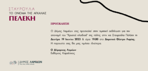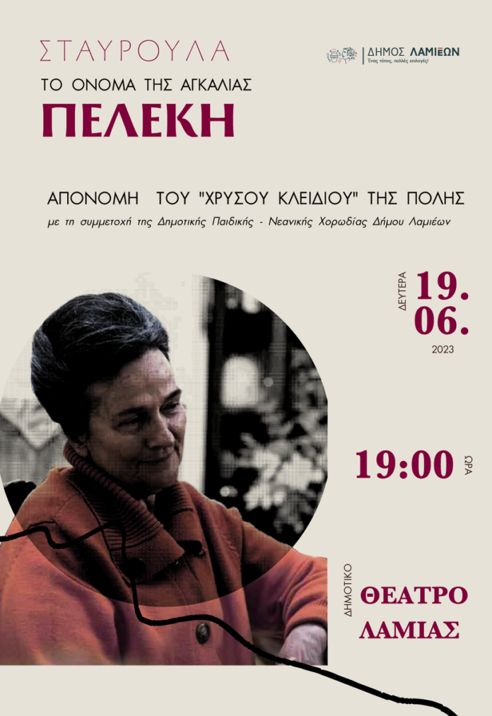 Ο Δήμος Λαμιέων, αναγνωρίζοντας το πολυσήμαντο έργο της κυρίας Σταυρούλας Πελέκη, πραγματοποιεί προς τιμήν της εκδήλωση απονέμοντάς της το «Χρυσό κλειδί» της πόλης, τη Δευτέρα 19 Ιουνίου 2023 και ώρα 19:00, στο Δημοτικό Θέατρο Λαμίας.