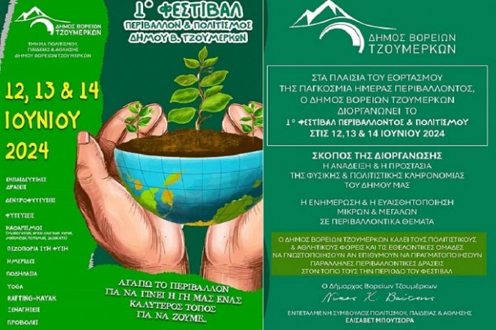 Το 1ο Φεστιβάλ Περιβάλλοντος και Πολιτισμού διοργανώνει ο Δήμος Βορείων Τζουμέρκων και το Τμήμα Πολιτισμού, Παιδείας και Άθλησης στις 12, 13 και 14 Ιουνίου, στο πλαίσιο της Παγκόσμιας Ημέρας Περιβάλλοντος.