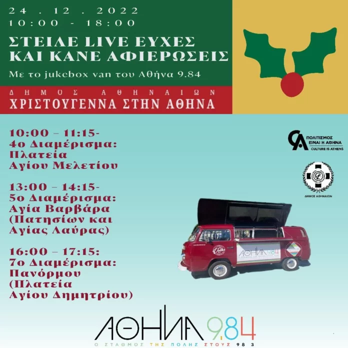 Παραμονές Χριστουγέννων και Πρωτοχρονιάς, ο Αθήνα 9.84 δίνει το λόγο στους ακροατές του και γιορτάζει, πλημμυρίζοντας τις γειτονιές της Αθήνας με χαρά, τραγούδια και ατελείωτη μουσική!