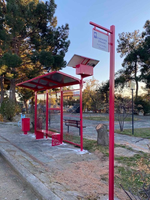 • Την τοποθέτηση εξοπλισμού στεγάστρου (ανακλινόμενο καθιστικό, φωτοβολταϊκό πάνελ, φωτισμός led με χρήση φωτοβολταϊκών πάνελ, πλαίσια αναγραφής ονομασίας της στάσης, πινακίδα της στάσης, κάδος απορριμμάτων, κλπ).
