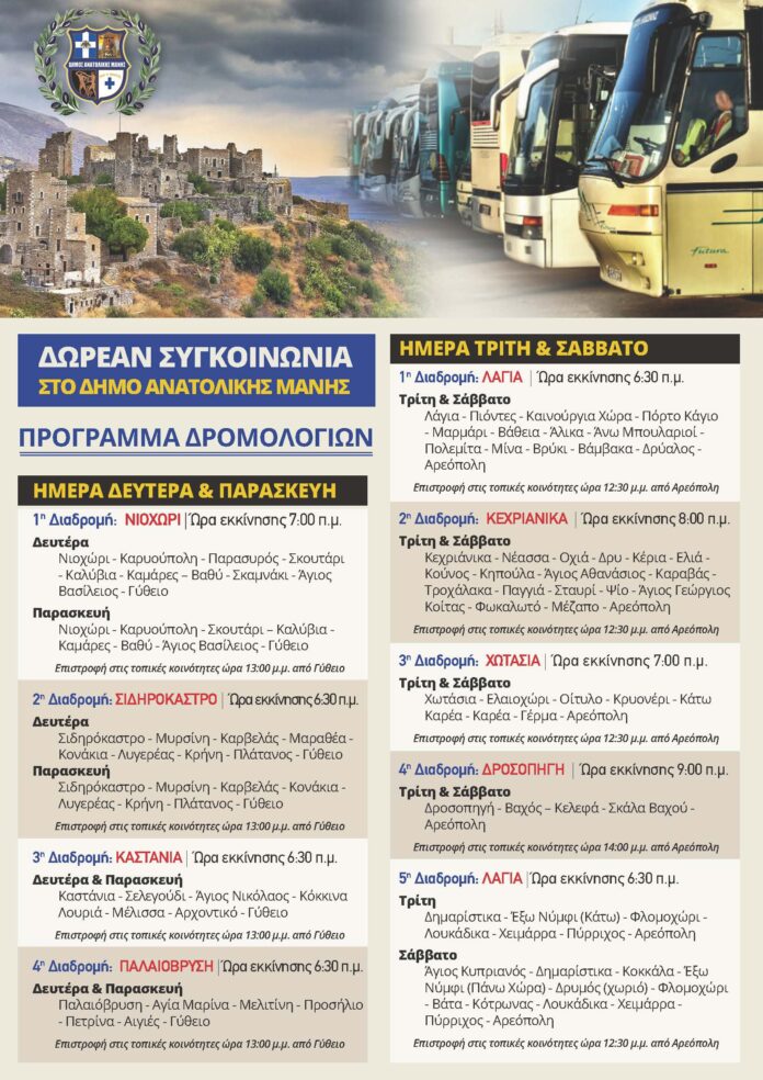 Δωρεάν συγκοινωνία σε όλα τα χωριά του Δήμου θα έχουν την ευκαιρία να απολαμβάνουν κάτοικοι και επισκέπτες του Δήμου Ανατολικής Μάνης από τη Μεγάλη Δευτέρα 10 Απριλίου 2023. Το μέτρο που αφορά τη μετακίνηση μεταξύ των δημοτικών κοινοτήτων από και προς το Γύθειο (έδρα) και την Αρεόπολη (ιστορική έδρα), με συχνότητα δύο φορές την εβδομάδα, είχε τεθεί ως πρόταση από τη Δημοτική Αρχή τον Οκτώβριο του 2021 κι είχε γίνει αποδεκτή από τους προέδρους τοπικών κοινοτήτων.